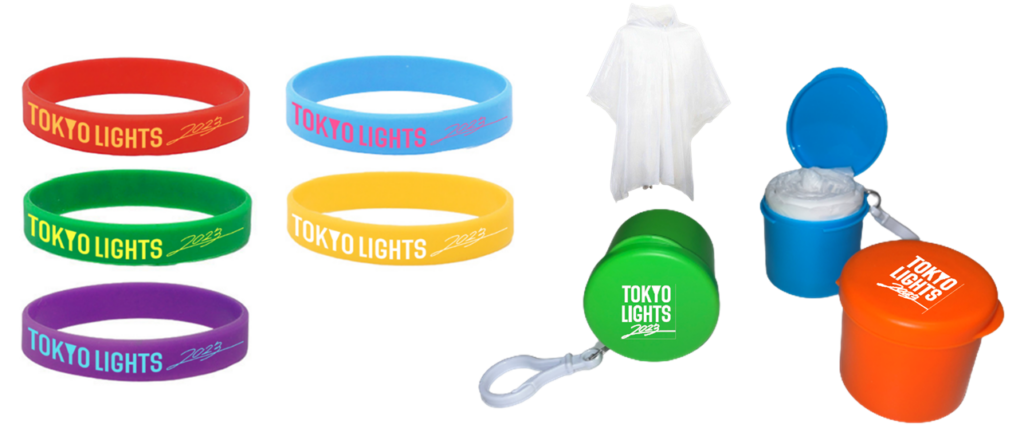 光の祭典エリアへの入場とプロジェクションマッピング国際大会「1minute Projection Mapping Competition」を観覧エリアで鑑賞できる有料チケットをご購入いただいた方には、入場口にて『TOKYO LIGHTS 2023オリジナルリストバンド』と『 TOKYO LIGHTS 2023オリジナル 携帯ポンチョ』をご来場者様全員にもれなくプレゼントいたします!
