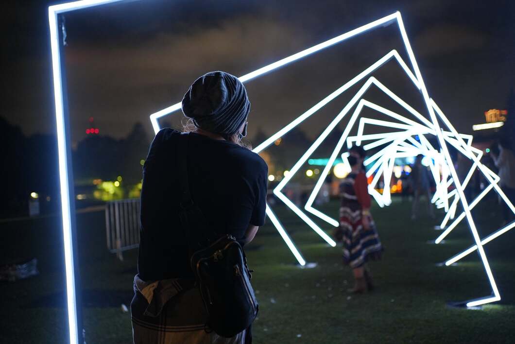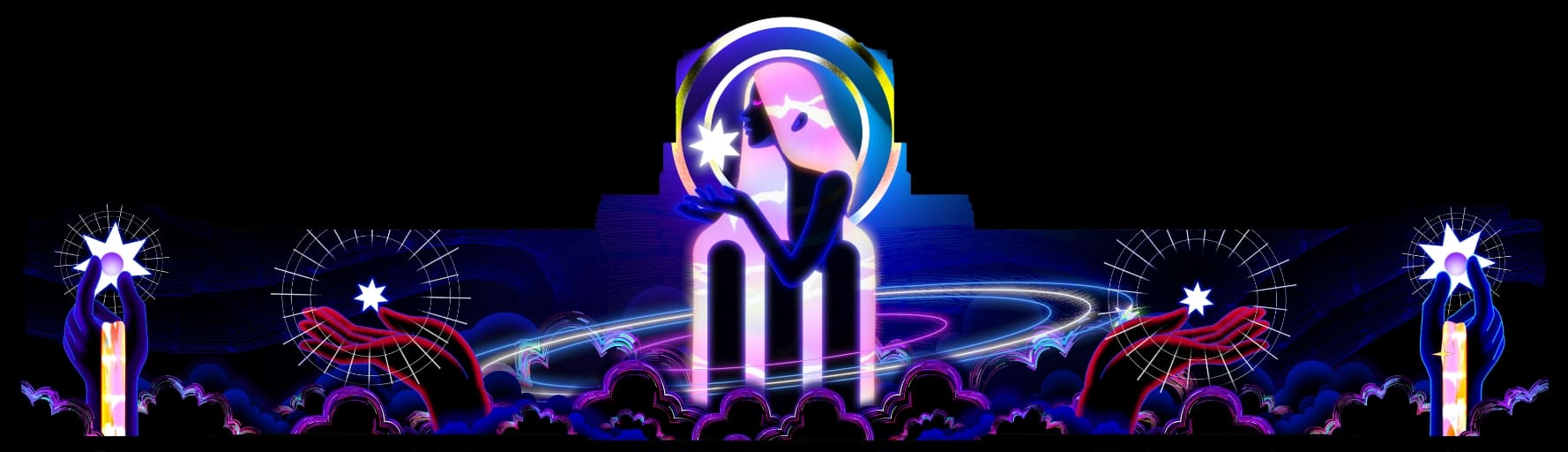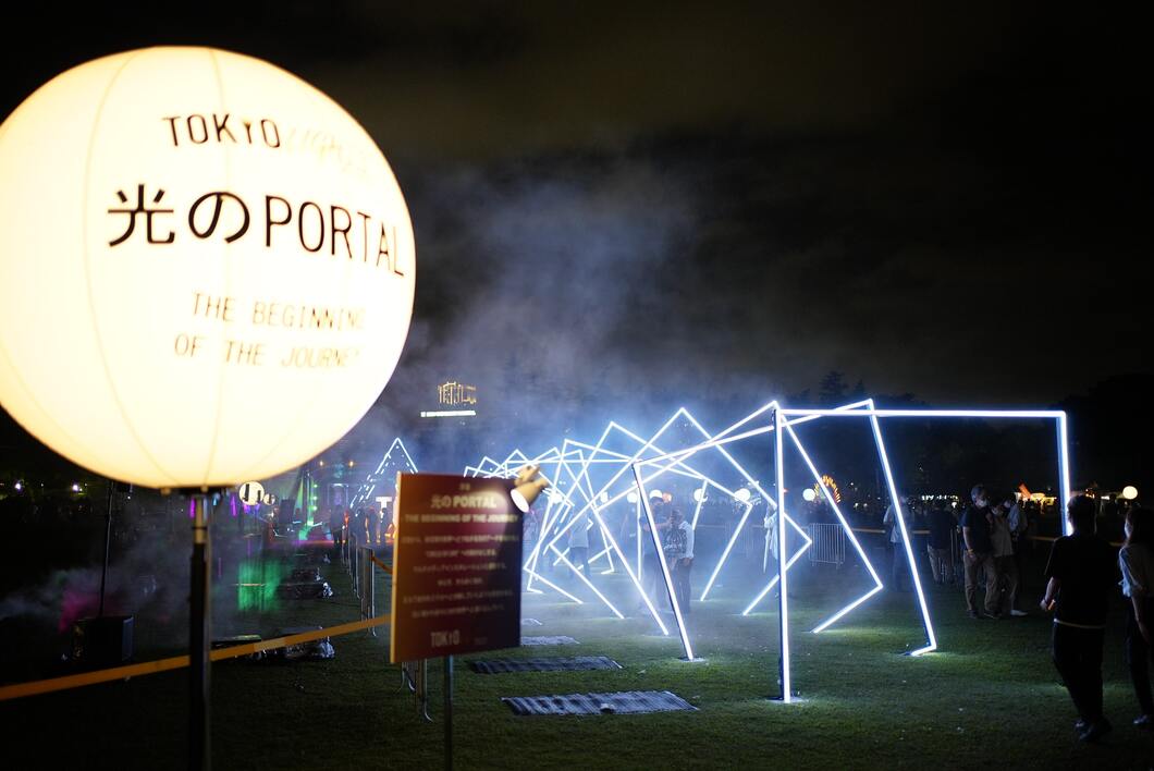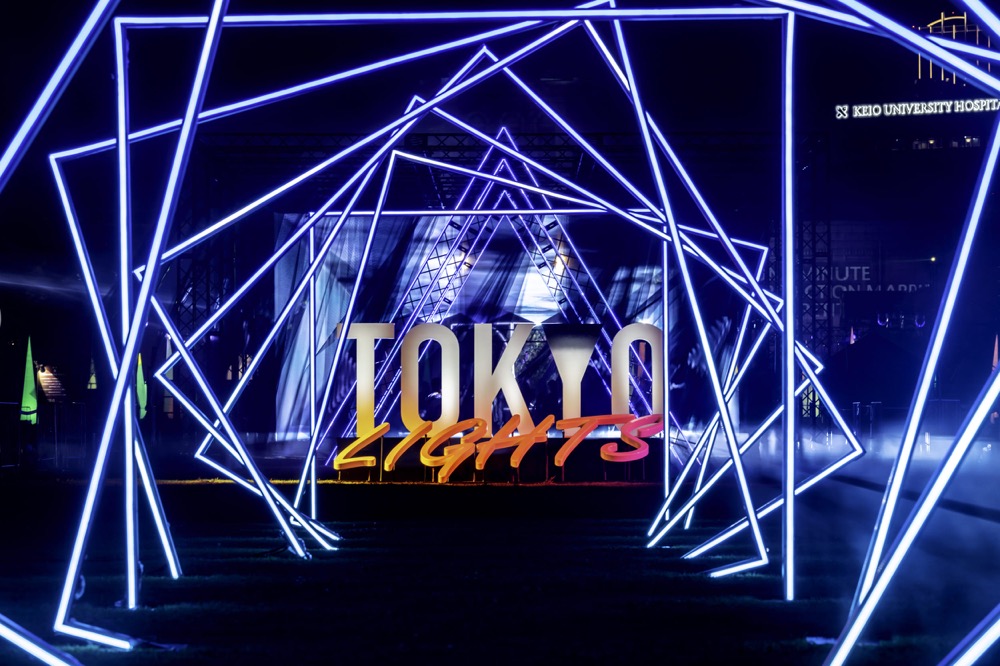 The journey of light begins as you pass through a portal of light that leads you from the everyday world to an extraordinary one. The flickering, twinkling lights, enveloped in neon colors connected to a multimedia installation, evoke the sensation of gradually melting into this world of light, beyond which the TOKYO LIGHTS artwork-designed logo appears.