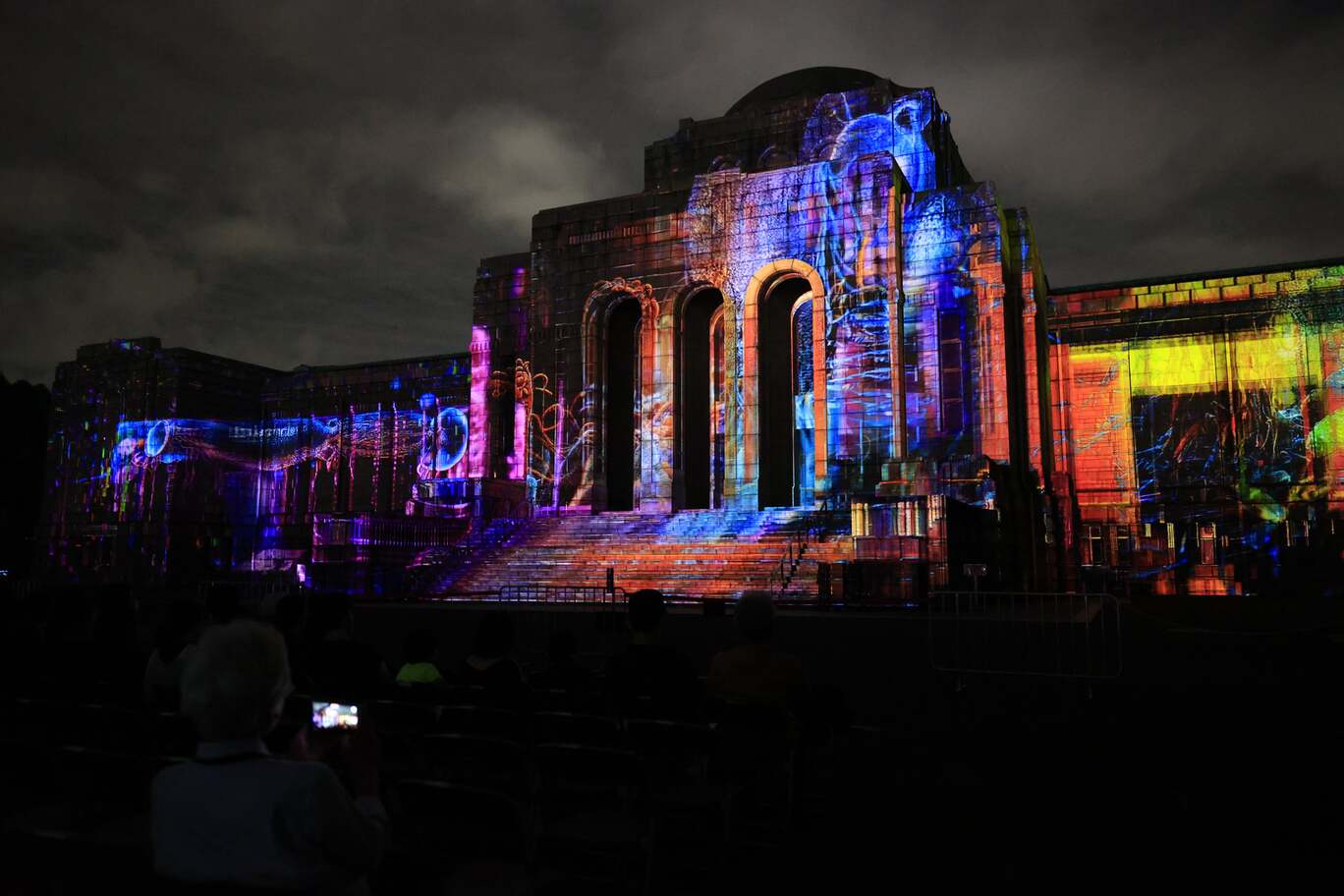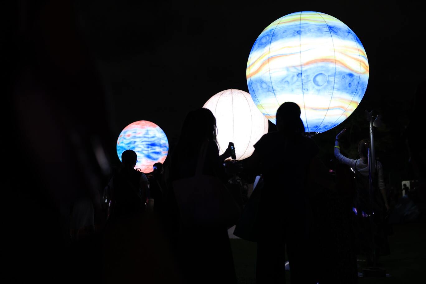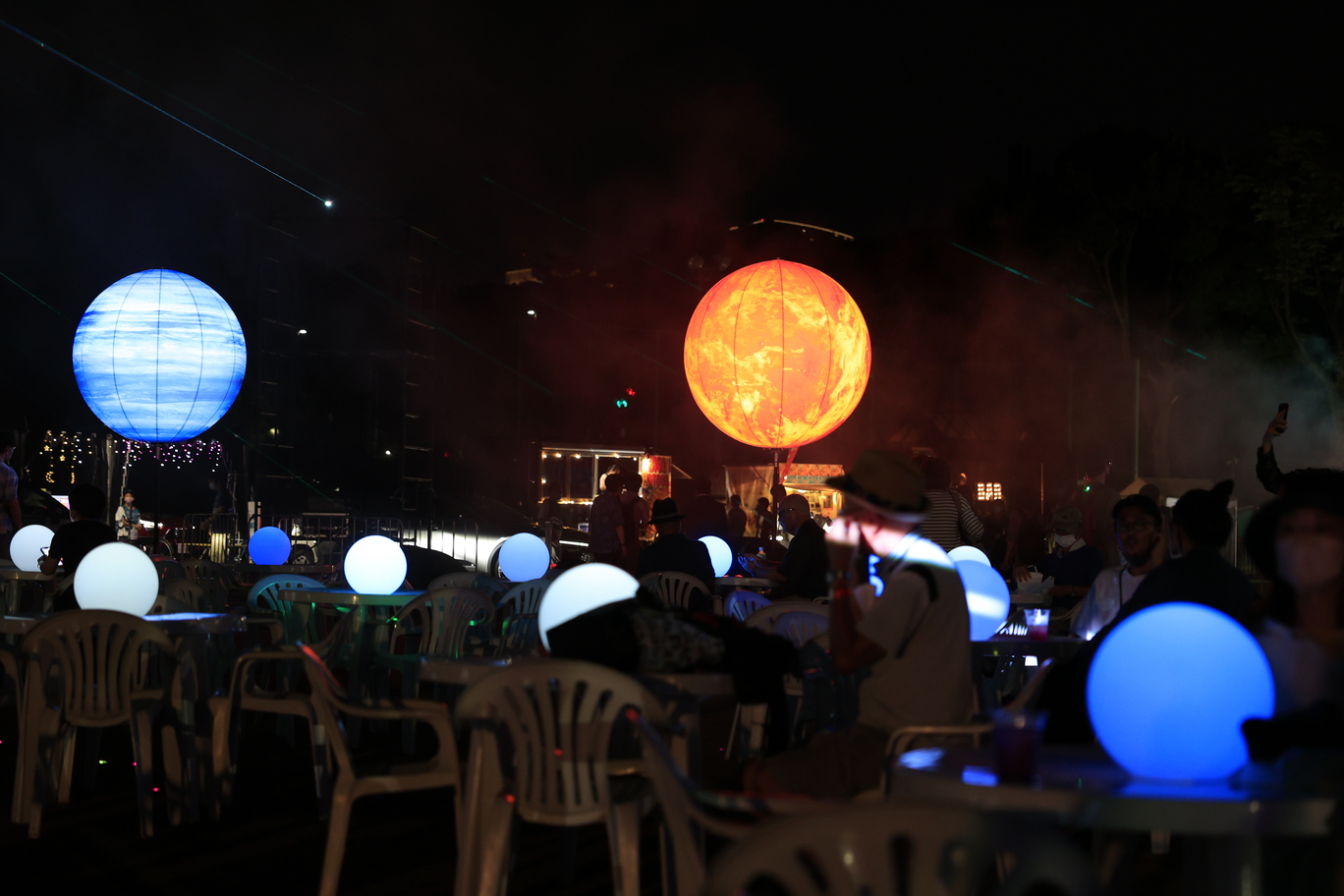 The last stop on our journey of light is a sky of infinite light. In a space designed with light objects and fiber beams, visitors can enjoy food and drinks while watching the finalists’ works in the International Projection Mapping Competition.